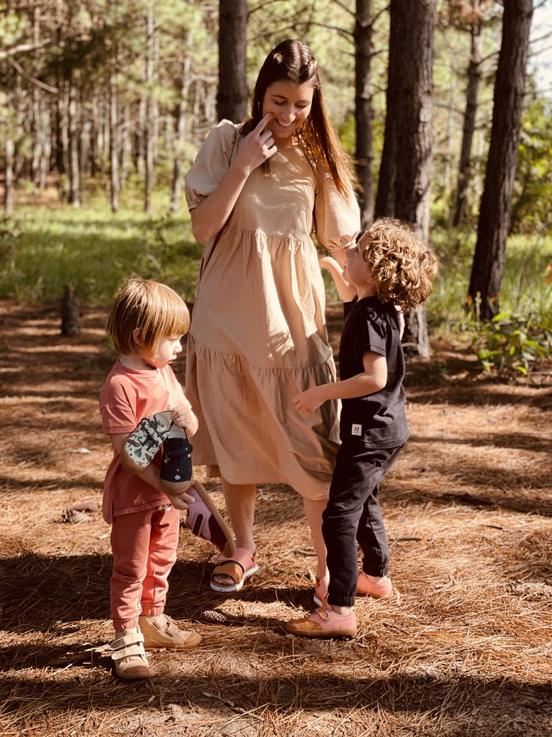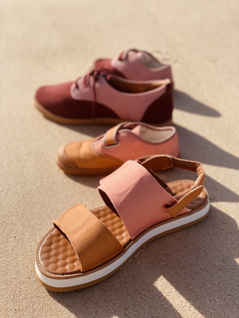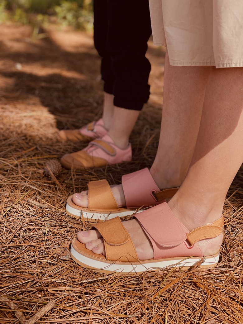 Meio sandália plataforma, meio chinelo. Tiras reguláveis com velcro, tira traseira removível. Feita com tecido de reuso feito de garrafas PET recicladas e desenvolvida com a Luft Shoes. Na versão adulto e mini, pra fazer parzinho de looks com os pequenos.
